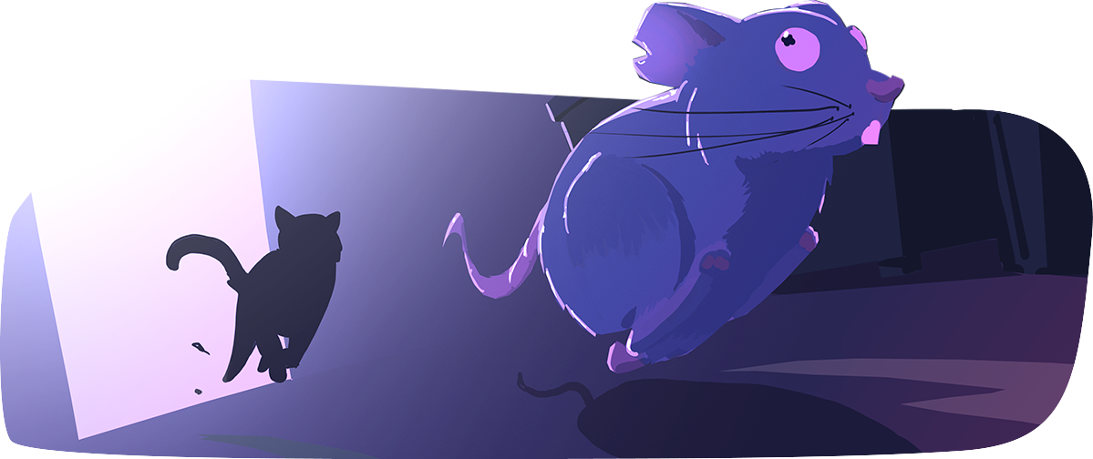 Un vieux rat visiblement. J’espère juste pas trop vieux, sinon ils ont un goût de poussière. Il renverse tout sur son passage pour entamer sa fuite perdue d'avance. Mes pattes sont rouillées et rongées par la flemme, mais je les rappelle à l'ordre.